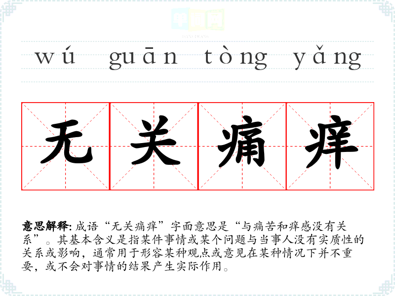 成语“无关痛痒”字面意思是“与痛苦和痒感没有关系”。其基本含义是指某件事情或某个问题与当事人没有实质性的关系或影响,通常用于形容某种观点或意见在某种情况下并不重要,或不会对事情的结果产生实际作用。