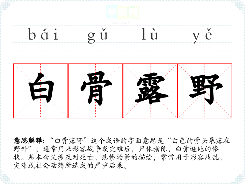 “白骨露野”这个成语的字面意思是“白色的骨头暴露在野外”,通常用来形容战争或灾难后,尸体横陈,白骨遍地的惨状。基本含义涉及对死亡、悲惨场景的描绘,常常用于形容战乱、灾难或社会动荡所造成的严重后果。