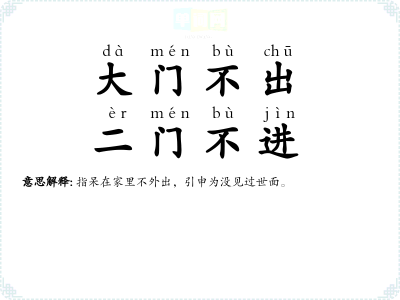 | 不登大雅之堂 | 大雅:高贵典雅。不能登上高雅的厅堂。形容某些不被人看重的、“粗俗”的事物(多指文艺作品)。 |