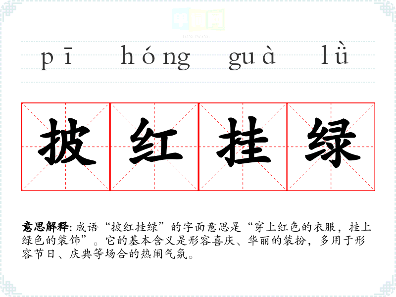 成语“披红挂绿”的字面意思是“穿上红色的衣服,挂上绿色的装饰”。它的基本含义是形容喜庆、华丽的装扮,多用于形容节日、庆典等场合的热闹气氛。