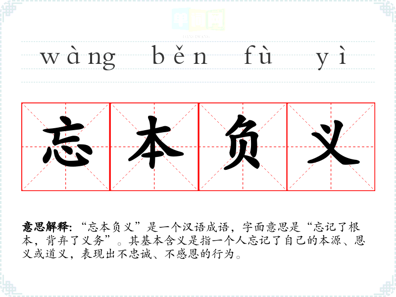 “忘本负义”是一个汉语成语,字面意思是“忘记了根本,背弃了义务”。其基本含义是指一个人忘记了自己的本源、恩义或道义,表现出不忠诚、不感恩的行为。