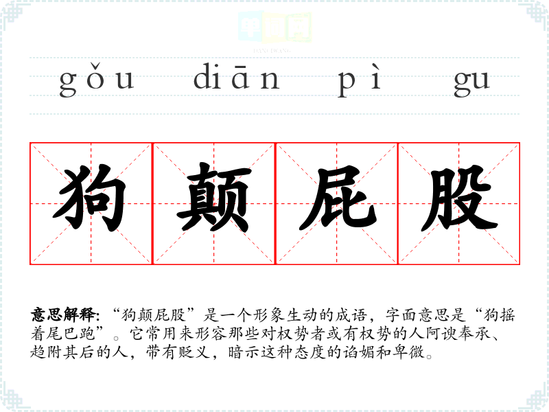 “狗颠屁股”是一个形象生动的成语,字面意思是“狗摇着尾巴跑”。它常用来形容那些对权势者或有权势的人阿谀奉承、趋附其后的人,带有贬义,暗示这种态度的谄媚和卑微。