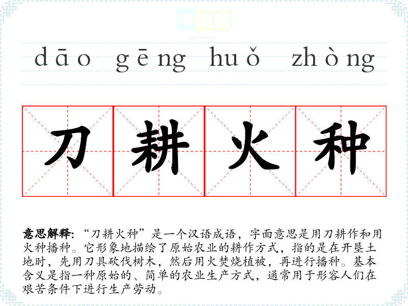| 刀耕火种 | 古时一种耕种方法,把地上的草烧成灰做肥料,就地挖坑下种。 |