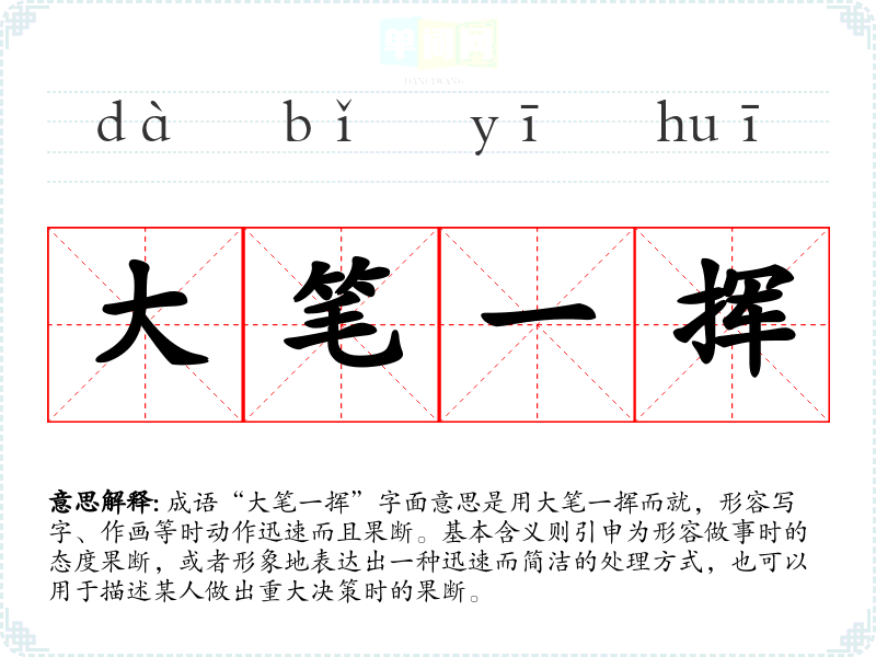 在**传统文化中,书法和绘画被视为高雅艺术,代表了个人的修养与气质。“大笔一挥”不仅体现了艺术创作的潇洒与自信,也反映了社会对果断决策能力的重视。在现代社会,尤其在商业和政治领域,果断的决策被广泛推崇,因此该成语在现代语境中依然具有重要的适用性。