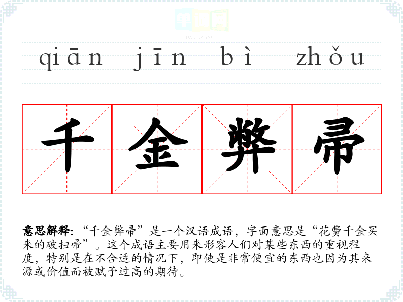 “千金弊帚”是一个汉语成语,字面意思是“花费千金买来的破扫帚”。这个成语主要用来形容人们对某些东西的重视程度,特别是在不合适的情况下,即使是非常便宜的东西也因为其来源或价值而被赋予过高的期待。