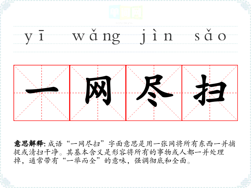 成语“一网尽扫”字面意思是用一张网将所有东西一并捕捉或清扫干净。其基本含义是形容将所有的事物或人都一并处理掉,通常带有“一举而全”的意味,强调彻底和全面。