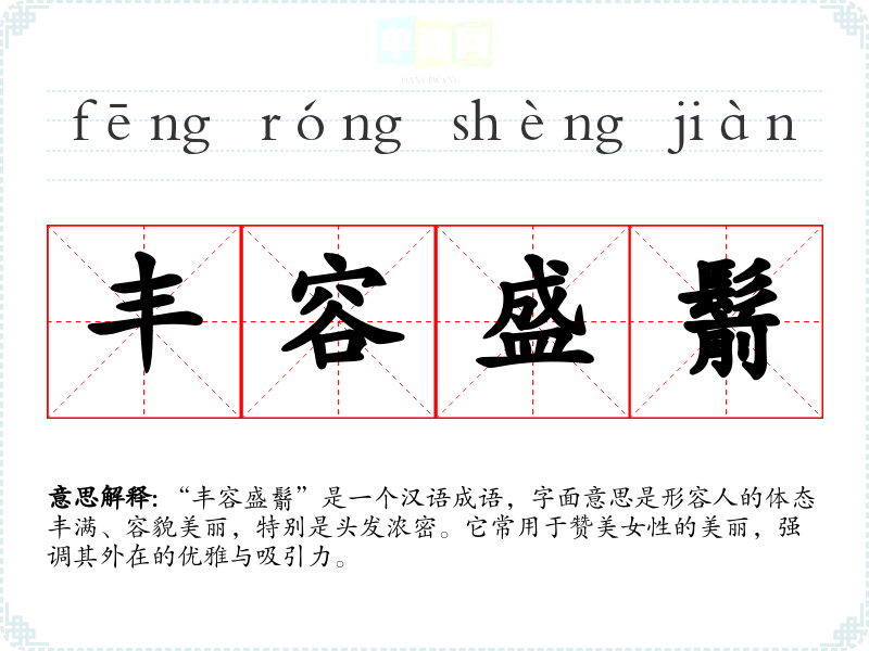 “丰容盛鬋”是一个汉语成语,字面意思是形容人的体态丰满、容貌美丽,特别是头发浓密。它常用于赞美女性的美丽,强调其外在的优雅与吸引力。