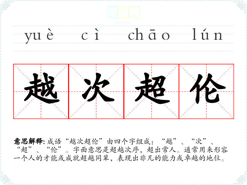 成语“越次超伦”由四个字组成:“越”、“次”、“超”、“伦”。字面意思是超越次序,超出常人。通常用来形容一个人的才能或成就超越同辈,表现出非凡的能力或卓越的地位。
