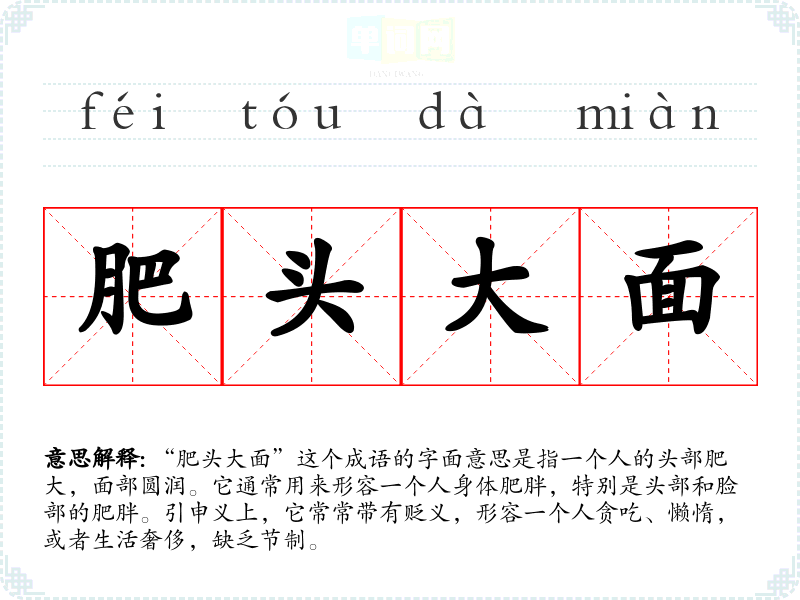 “肥头大面”这个成语的字面意思是指一个人的头部肥大,面部圆润。它通常用来形容一个人身体肥胖,特别是头部和脸部的肥胖。引申义上,它常常带有贬义,形容一个人贪吃、懒惰,或者生活奢侈,缺乏节制。