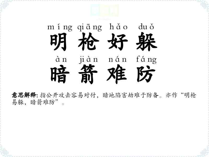 | 明枪易躲,暗箭难防 | 明处来的枪容易躲开,暗中射来的箭难以提防。比喻种种公开的和隐蔽的攻击。 |