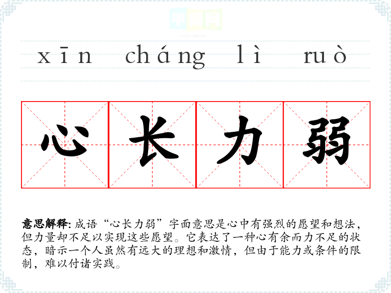 成语“心长力弱”字面意思是心中有强烈的愿望和想法,但力量却不足以实现这些愿望。它表达了一种心有余而力不足的状态,暗示一个人虽然有远大的理想和激情,但由于能力或条件的限制,难以付诸实践。