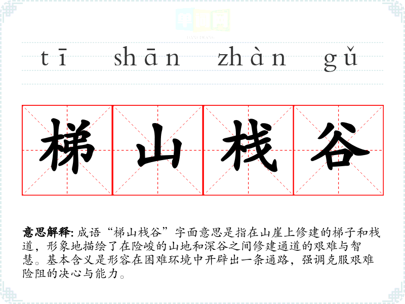 成语“梯山栈谷”字面意思是指在山崖上修建的梯子和栈道,形象地描绘了在险峻的山地和深谷之间修建通道的艰难与智慧。基本含义是形容在困难环境中开辟出一条通路,强调克服艰难险阻的决心与能力。