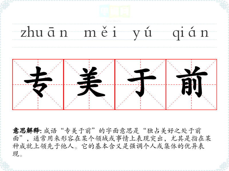 成语“专美于前”的字面意思是“独占美好之处于前面”,通常用来形容在某个领域或事情上表现突出,尤其是指在某种成就上领先于他人。它的基本含义是强调个人或集体的优异表现。