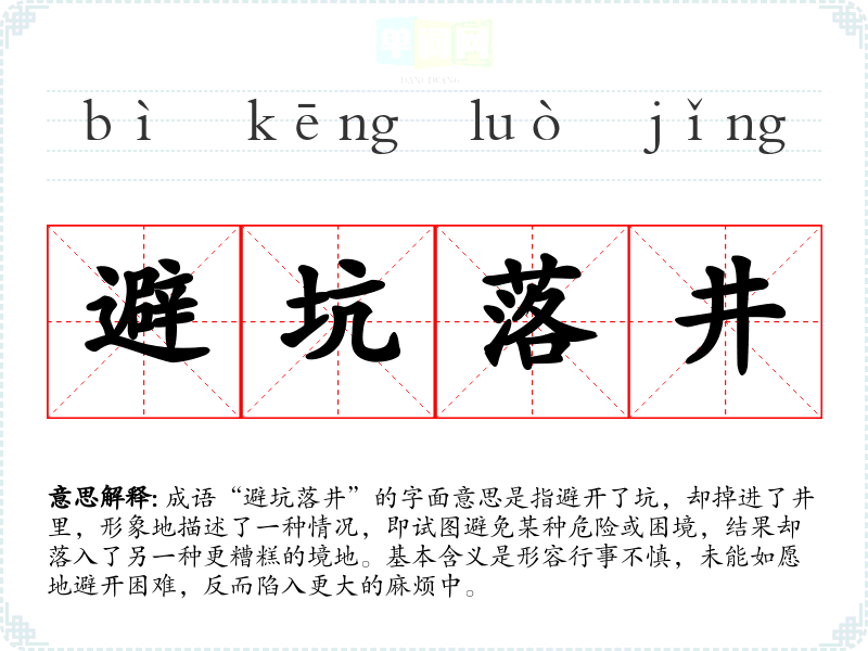 成语“避坑落井”的字面意思是指避开了坑,却掉进了井里,形象地描述了一种情况,即试图避免某种危险或困境,结果却落入了另一种更糟糕的境地。基本含义是形容行事不慎,未能如愿地避开困难,反而陷入更大的麻烦中。