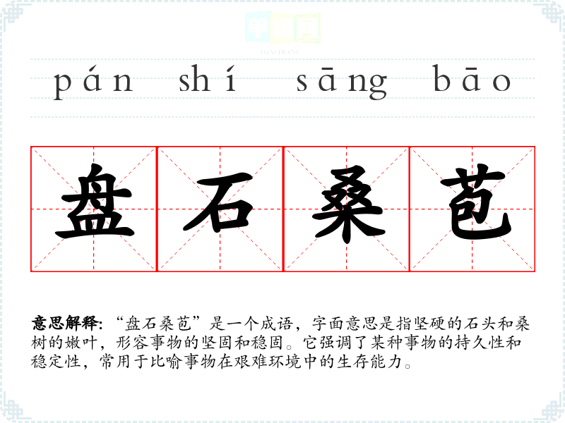 “盘石桑苞”出自《诗经》,原文为“盘石之下,桑苞之上”,意在强调在艰难条件下依然能够生存和发展。这一成语体现了古人对自然界的观察与思考,表现出一种顽强的生命力。
