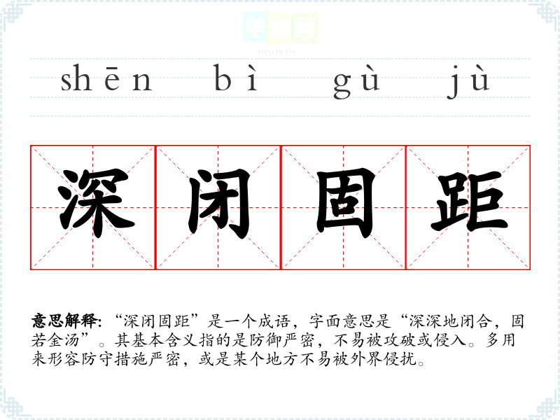 “深闭固距”是一个成语,字面意思是“深深地闭合,固若金汤”。其基本含义指的是防御严密,不易被攻破或侵入。多用来形容防守措施严密,或是某个地方不易被外界侵扰。