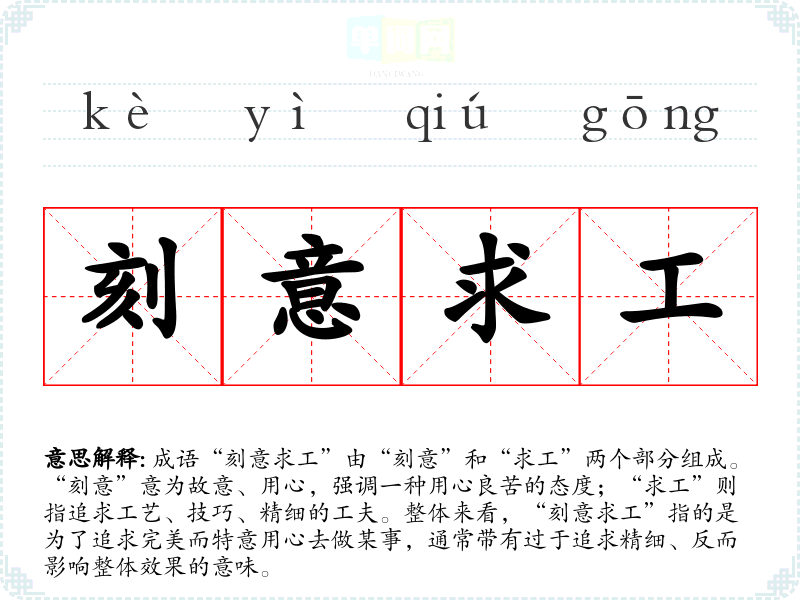 成语“刻意求工”由“刻意”和“求工”两个部分组成。“刻意”意为故意、用心,强调一种用心良苦的态度;“求工”则指追求工艺、技巧、精细的工夫。整体来看,“刻意求工”指的是为了追求完美而特意用心去做某事,通常带有过于追求精细、反而影响整体效果的意味。