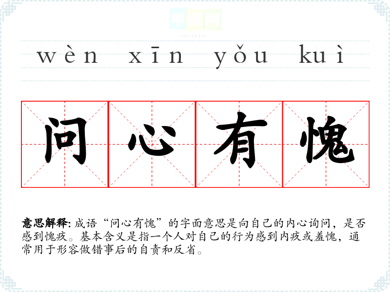 成语“问心有愧”的字面意思是向自己的内心询问,是否感到愧疚。基本含义是指一个人对自己的行为感到内疚或羞愧,通常用于形容做错事后的自责和反省。