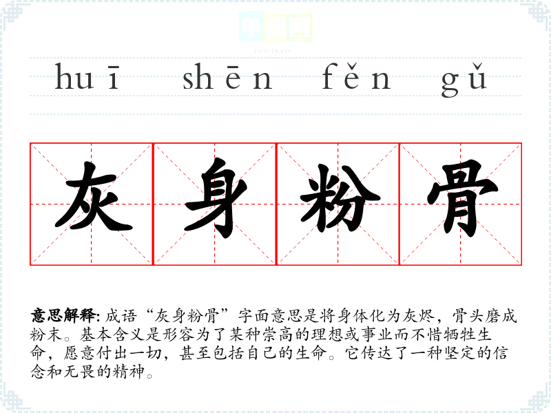 成语“灰身粉骨”字面意思是将身体化为灰烬,骨头磨成粉末。基本含义是形容为了某种崇高的理想或事业而不惜牺牲生命,愿意付出一切,甚至包括自己的生命。它传达了一种坚定的信念和无畏的精神。