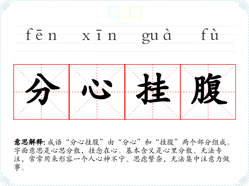 成语“分心挂腹”由“分心”和“挂腹”两个部分组成。字面意思是心思分散,挂念在心。基本含义是心里分散、无法专注,常常用来形容一个人心神不宁、思虑繁杂,无法集中注意力做事。
