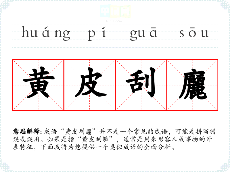 成语“黄皮刮廲”并不是一个常见的成语,可能是拼写错误或误用。如果是指“黄皮刮鳞”,通常是用来形容人或事物的外表特征,下面我将为您提供一个类似成语的全面分析。