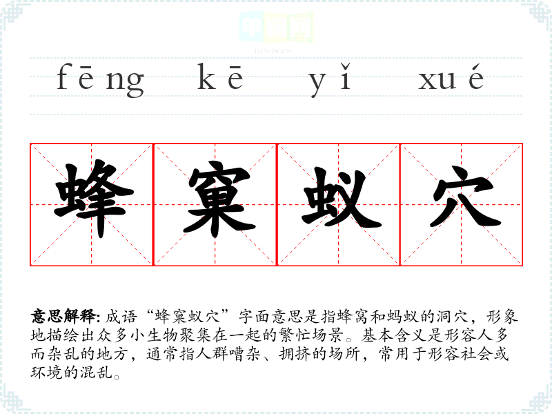 成语“蜂窠蚁穴”字面意思是指蜂窝和蚂蚁的洞穴,形象地描绘出众多小生物聚集在一起的繁忙场景。基本含义是形容人多而杂乱的地方,通常指人群嘈杂、拥挤的场所,常用于形容社会或环境的混乱。