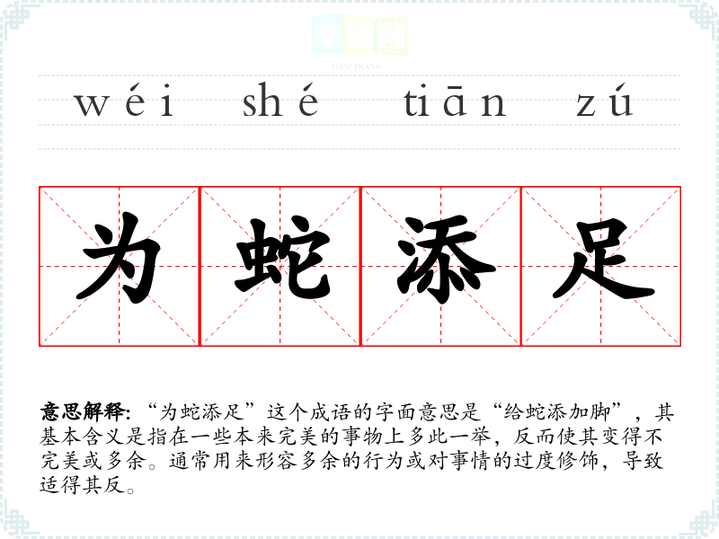 “为蛇添足”这个成语的字面意思是“给蛇添加脚”,其基本含义是指在一些本来完美的事物上多此一举,反而使其变得不完美或多余。通常用来形容多余的行为或对事情的过度修饰,导致适得其反。