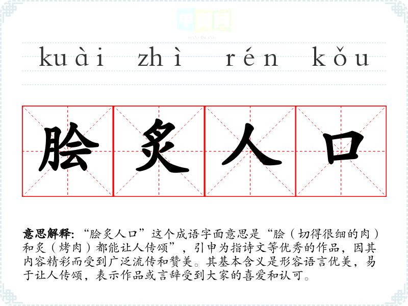 “脍炙人口”这个成语字面意思是“脍(切得很细的肉)和炙(烤肉)都能让人传颂”,引申为指诗文等优秀的作品,因其内容精彩而受到广泛流传和赞美。其基本含义是形容语言优美,易于让人传颂,表示作品或言辞受到大家的喜爱和认可。