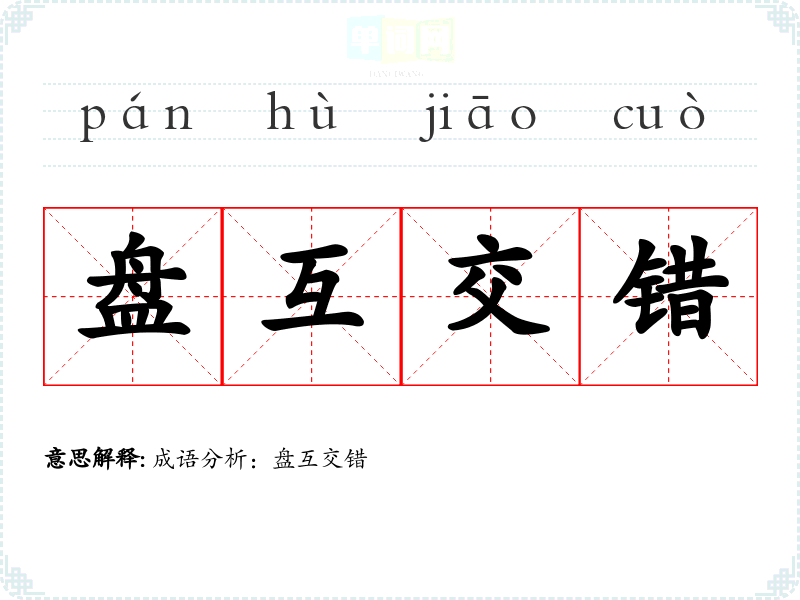 “盘互交错”由“盘”、“互”、“交”、“错”四个字组成。字面意思是指盘状的物体相互交织、交错在一起。引申义通常用来形容事物复杂交织的状态,常用在形容关系、情况等的复杂性。
