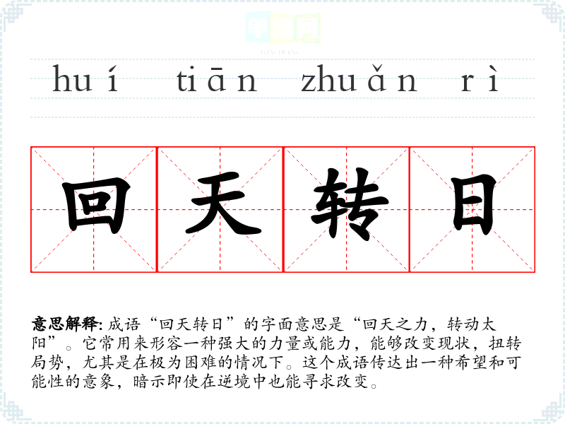成语“回天转日”的字面意思是“回天之力,转动太阳”。它常用来形容一种强大的力量或能力,能够改变现状,扭转局势,尤其是在极为困难的情况下。这个成语传达出一种希望和可能性的意象,暗示即使在逆境中也能寻求改变。