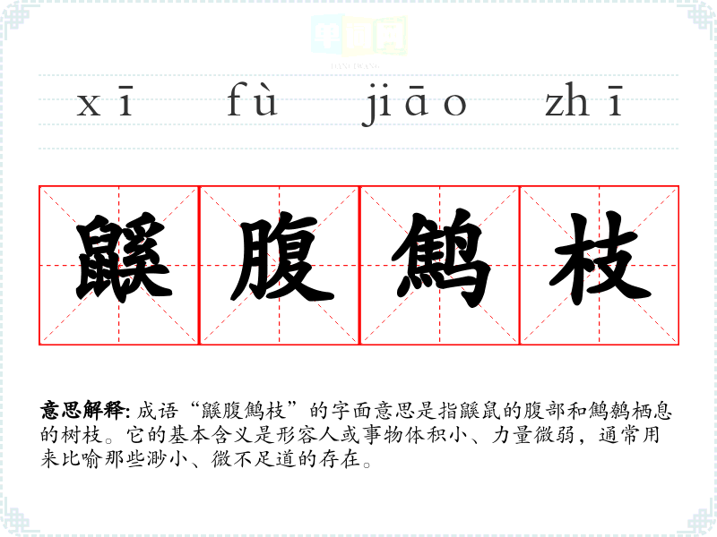 成语“鼷腹鹪枝”的字面意思是指鼷鼠的腹部和鹪鹩栖息的树枝。它的基本含义是形容人或事物体积小、力量微弱,通常用来比喻那些渺小、微不足道的存在。