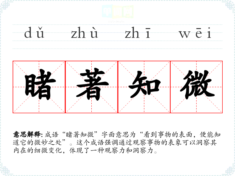 成语“睹著知微”字面意思为“看到事物的表面,便能知道它的微妙之处”。这个成语强调通过观察事物的表象可以洞察其内在的细微变化,体现了一种观察力和洞察力。