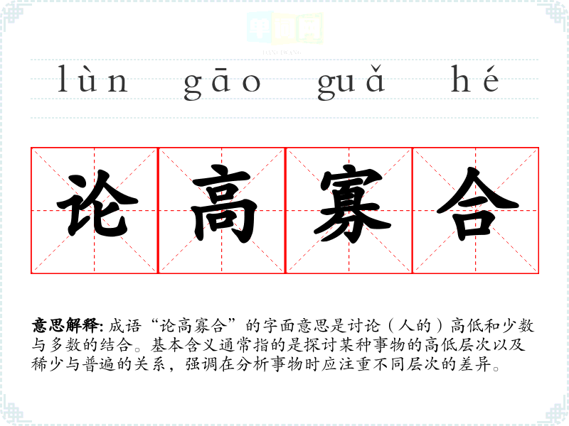 成语“论高寡合”的字面意思是讨论(人的)高低和少数与多数的结合。基本含义通常指的是探讨某种事物的高低层次以及稀少与普遍的关系,强调在分析事物时应注重不同层次的差异。