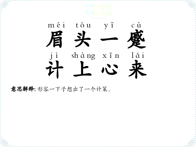 | 眉头一蹙,计上心来 | 形容一下子想出了一个计策。 |