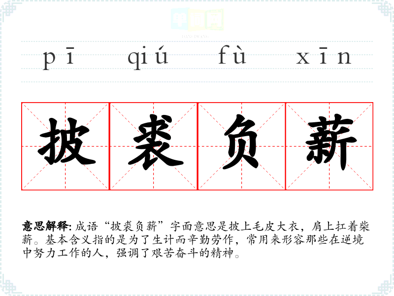 成语“披裘负薪”字面意思是披上毛皮大衣,肩上扛着柴薪。基本含义指的是为了生计而辛勤劳作,常用来形容那些在逆境中努力工作的人,强调了艰苦奋斗的精神。