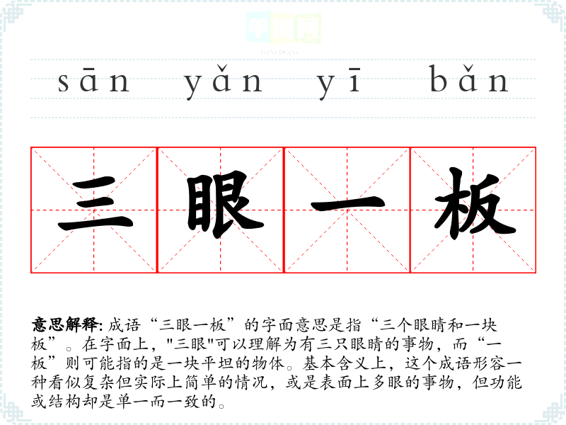成语“三眼一板”的字面意思是指“三个眼睛和一块板”。在字面上,"三眼"可以理解为有三只眼睛的事物,而“一板”则可能指的是一块平坦的物体。基本含义上,这个成语形容一种看似复杂但实际上简单的情况,或是表面上多眼的事物,但功能或结构却是单一而一致的。