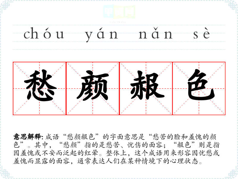 成语“愁颜赧色”的字面意思是“愁苦的脸和羞愧的颜色”。其中,“愁颜”指的是愁苦、忧伤的面容;“赧色”则是指因羞愧或不安而泛起的红晕。整体上,这个成语用来形容因忧愁或羞愧而显露的面容,通常表达人们在某种情境下的心理状态。