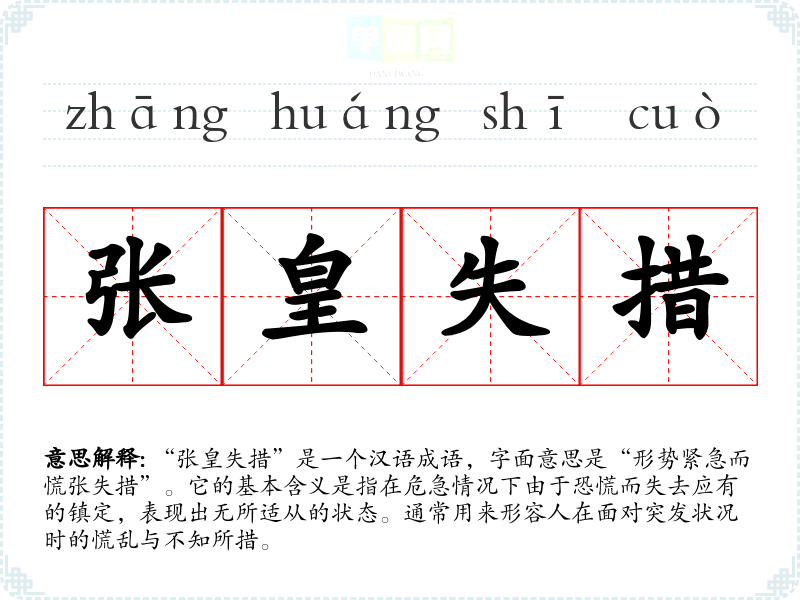 | 张惶失措 | 惊慌得不知怎么办才好 |