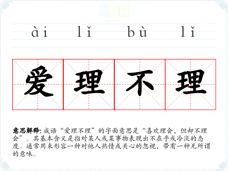 成语“爱理不理”的字面意思是“喜欢理会,但却不理会”。其基本含义是指对某人或某事物表现出不在乎或冷淡的态度。通常用来形容一种对他人热情或关心的忽视,带有一种无所谓的意味。