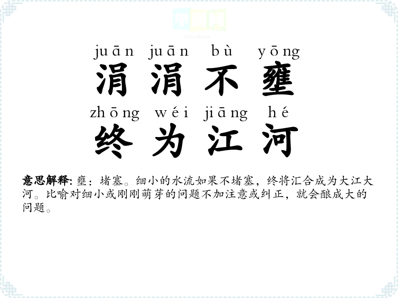 | 涓涓不壅,终为江河 | 壅:堵塞。细小的水流如果不堵塞,终将汇合成为大江大河。比喻对细小或刚刚萌芽的问题不加注意或纠正,就会酿成大的问题。 |