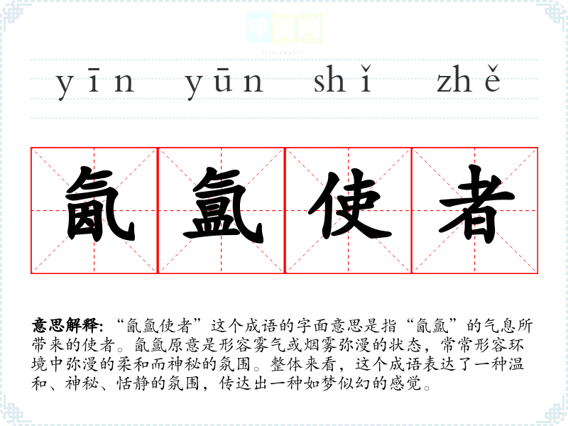 “氤氲使者”这个成语的字面意思是指“氤氲”的气息所带来的使者。氤氲原意是形容雾气或烟雾弥漫的状态,常常形容环境中弥漫的柔和而神秘的氛围。整体来看,这个成语表达了一种温和、神秘、恬静的氛围,传达出一种如梦似幻的感觉。