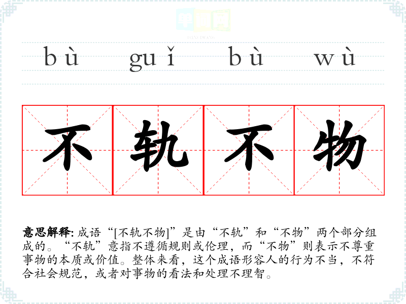 成语“[不轨不物]”是由“不轨”和“不物”两个部分组成的。“不轨”意指不遵循规则或伦理,而“不物”则表示不尊重事物的本质或价值。整体来看,这个成语形容人的行为不当,不符合社会规范,或者对事物的看法和处理不理智。