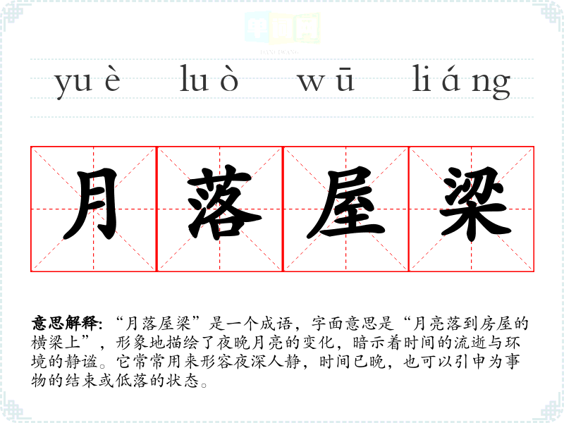 “月落屋梁”是一个成语,字面意思是“月亮落到房屋的横梁上”,形象地描绘了夜晚月亮的变化,暗示着时间的流逝与环境的静谧。它常常用来形容夜深人静,时间已晚,也可以引申为事物的结束或低落的状态。