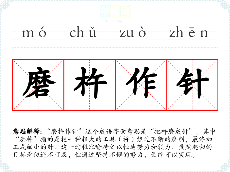 “磨杵作针”这个成语字面意思是“把杵磨成针”。其中“磨杵”指的是把一种粗大的工具(杵)经过不断的磨削,最终加工成细小的针。这一过程比喻持之以恒地努力和毅力,虽然起初的目标看似遥不可及,但通过坚持不懈的努力,最终可以实现。