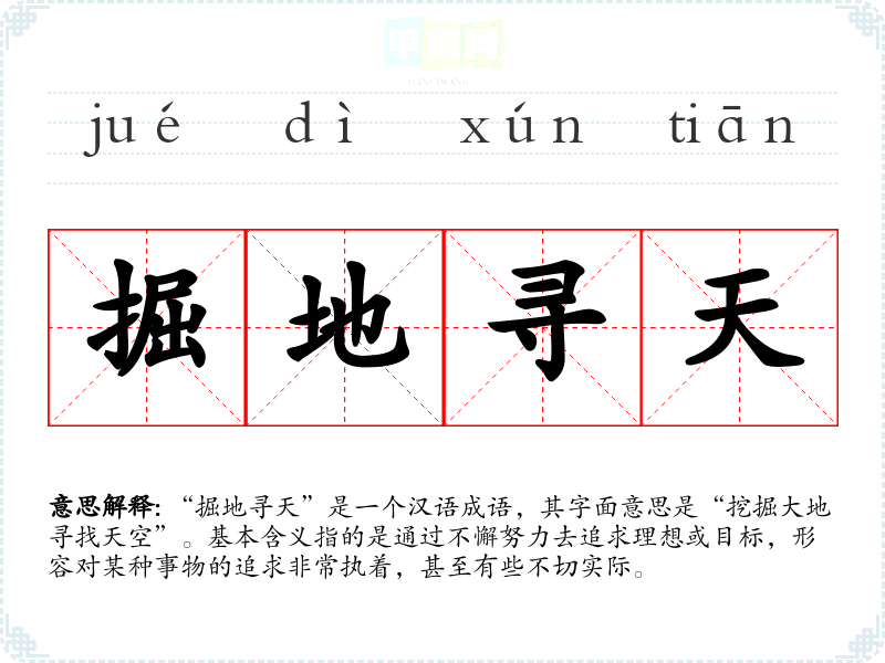 “掘地寻天”并不是一个古老的成语,更多的是在现代语境中被使用。该成语可以看作是对一些传统思想的反映,强调人们为了追求理想而进行的不懈努力。虽然没有明确的历史典故,但它与“追梦”或“追求理想”的主题相契合。