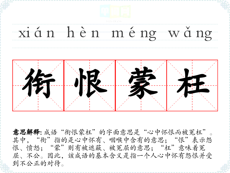 “衔恨蒙枉”这个成语来源于古代文学作品,尤其是与冤屈、仇恨相关的故事。具体的典故并不十分明确,但可以联系到许多古代文人对不公正对待的反思与表达。历史上,许多文人因政治斗争或误会而遭受冤屈,形成了对这一情况的普遍共鸣。