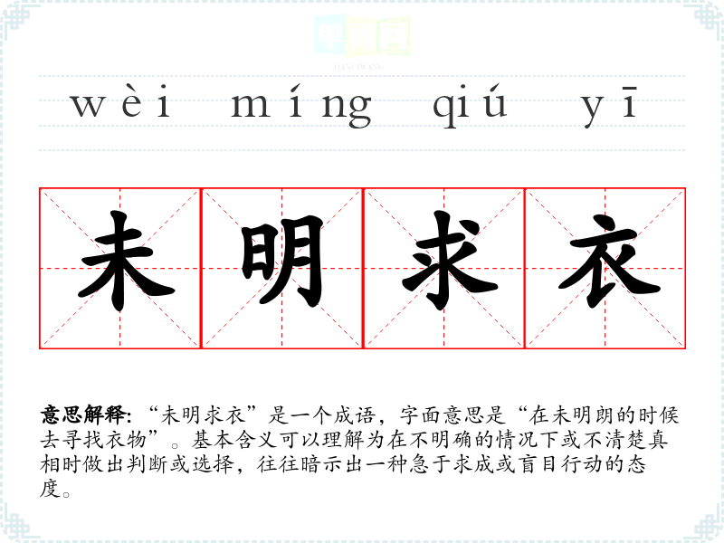 “未明求衣”是一个成语,字面意思是“在未明朗的时候去寻找衣物”。基本含义可以理解为在不明确的情况下或不清楚真相时做出判断或选择,往往暗示出一种急于求成或盲目行动的态度。