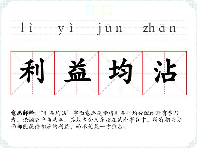 “利益均沾”并没有特定的历史典故或文学出处,它是现代汉语中一个常用的成语,反映了社会对公平分配的追求和重视。这个成语的形成与经济、社会关系的变化密切相关,尤其是现代社会对资源分配与合作共赢理念的重视。