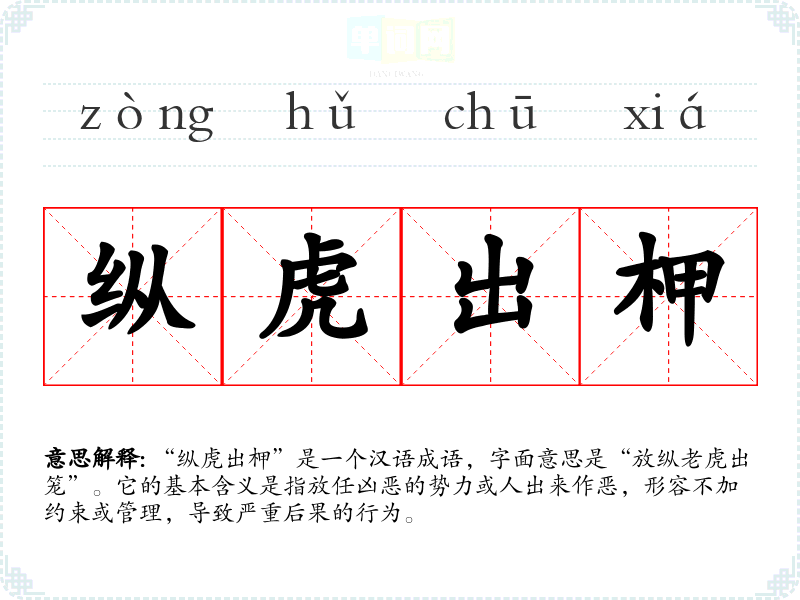 该成语的来源可以追溯到古代的典故。在《史记·吕不韦列传》中,有提到“纵虎出柙”的情形,意指放任具有危险性和破坏力的事物或人。成语中的“虎”象征着凶猛、危险的力量,而“柙”则是指关押**的笼子,结合在一起就形成了警示性和预警性。