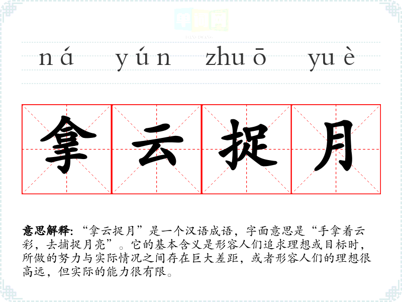 “拿云捉月”是一个汉语成语,字面意思是“手拿着云彩,去捕捉月亮”。它的基本含义是形容人们追求理想或目标时,所做的努力与实际情况之间存在巨大差距,或者形容人们的理想很高远,但实际的能力很有限。